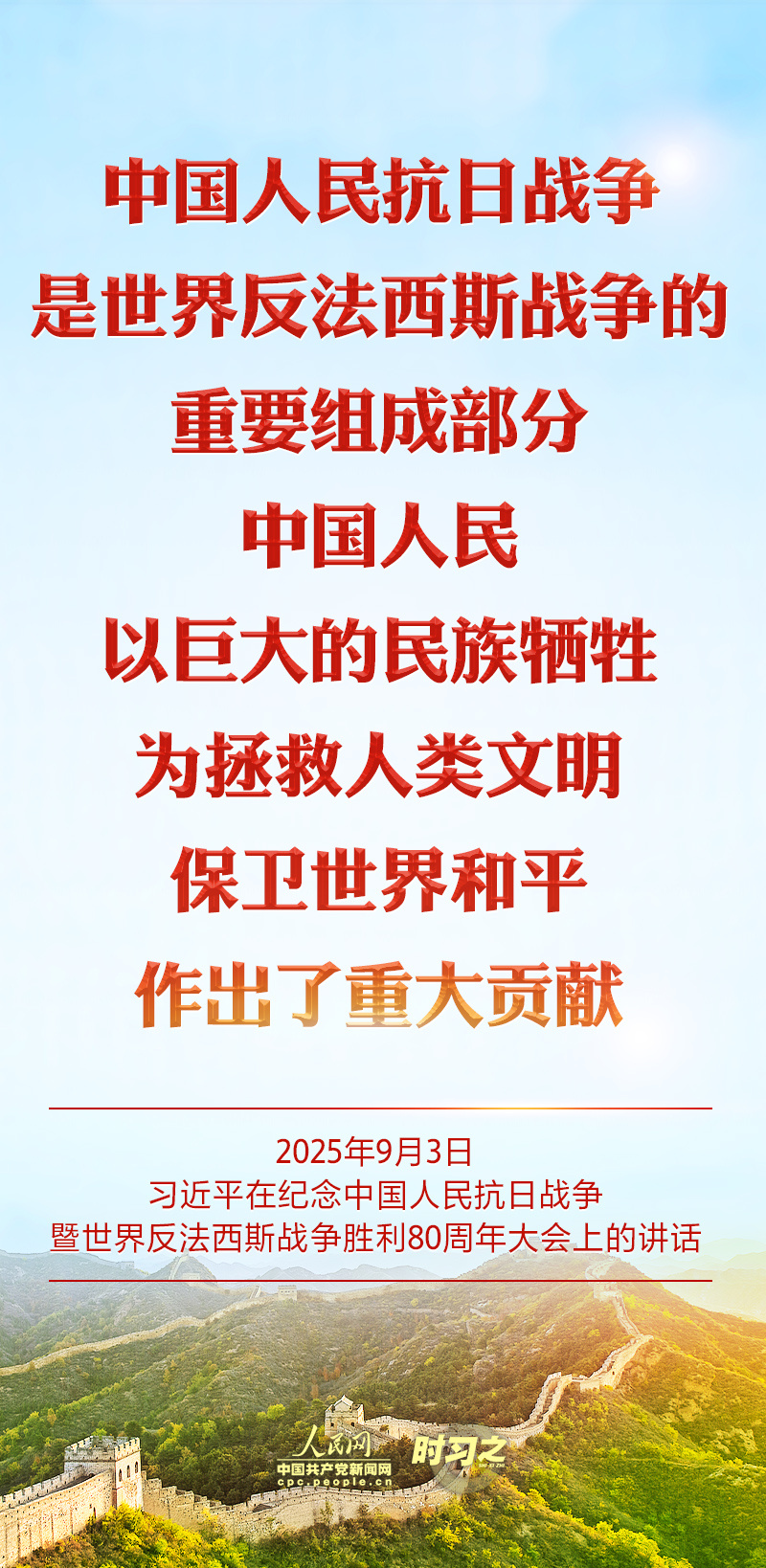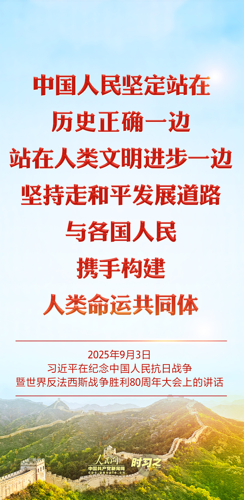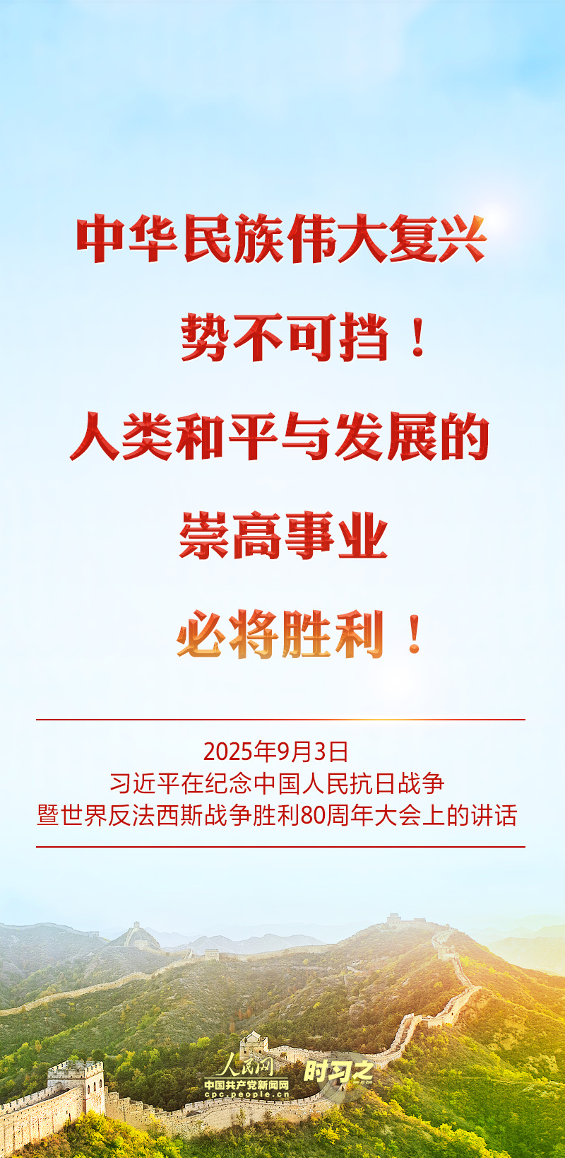 “中华民族伟大复兴势不可挡!人类和平与发展的崇高事业必将胜利!” 2025年9月3日,中共中央总书记、国家主席、中央军委主席习近平在纪念中国人民抗日战争暨世界反法西斯战争胜利80周年大会上的庄严宣示,道出了亿万人民的心声。